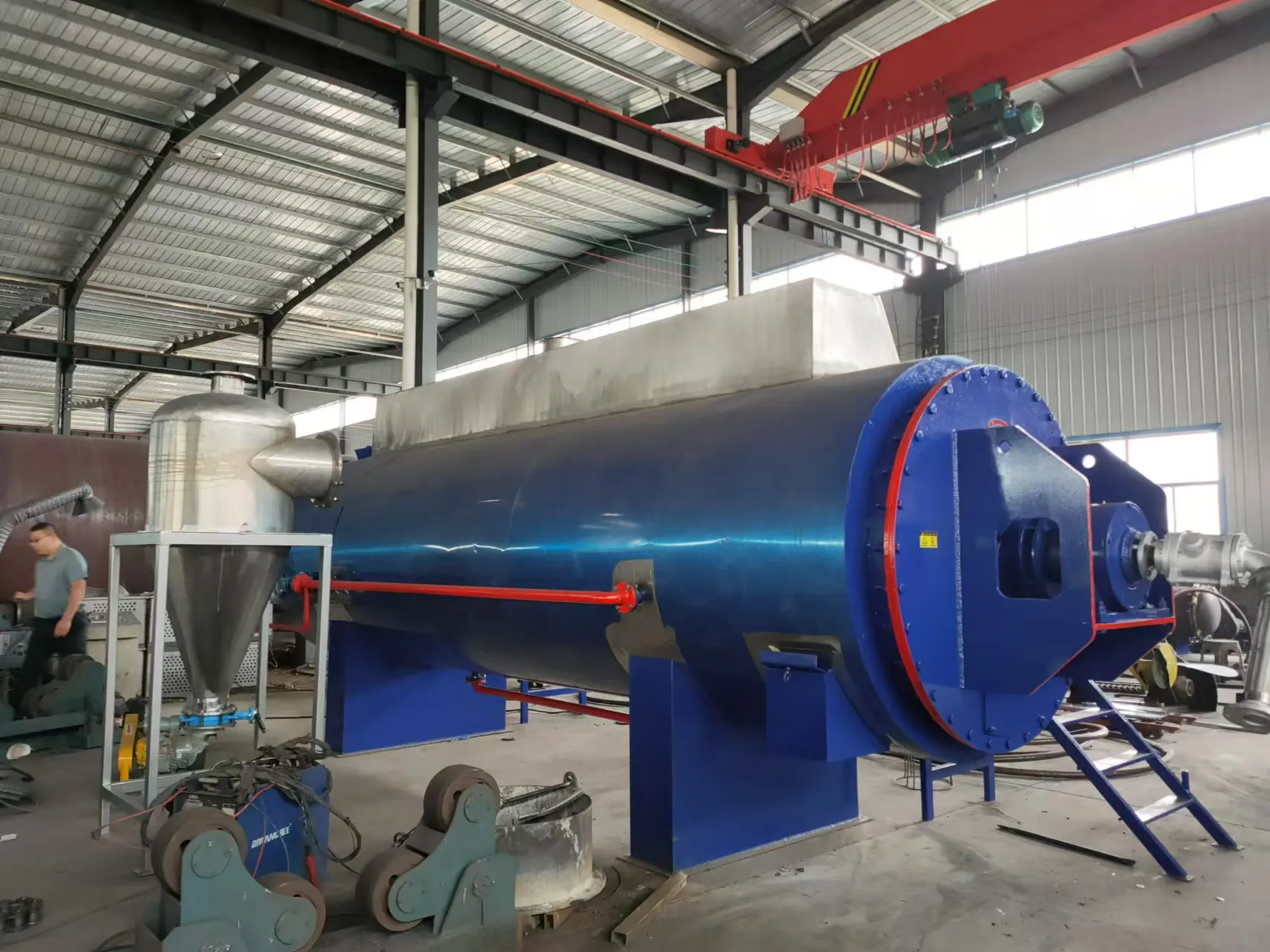 ເຄື່ອງນີ້ແມ່ນອຸປະກອນແຫ້ງຢ່າງຕໍ່ເນື່ອງ. ມັນໂອນຄວາມຮ້ອນໃຫ້ກັບວັດສະດຸຜ່ານກໍາແພງຄວາມຮ້ອນ. ສ່ວນຫນຶ່ງຂອງອາຍເຂົ້າໄປໃນພື້ນທີ່ກວ້າງຂວາງຮອບລະຫວ່າງຫອຍນອກແລະຝາດ້ານໃນຂອງກະບອກສູບໂດຍໃຊ້ວັດສະດຸພາຍໃນ, ດ້ວຍນ້ໍາທີ່ປົນເປື້ອນຈາກພອດລະບາຍນໍ້າ. ສ່ວນອີກສ່ວນຫນຶ່ງຂອງອາຍເຂົ້າໄປໃນເພົາຫລັກແລະລວດລາຍຕົ້ນຕໍ, ຄວາມຮ້ອນຂອງຕົ້ນໄມ້ຕົ້ນຕໍແລະວົງ, ເຊິ່ງມີນ້ໍາຂົ້ນຈາກການຮ່ວມນ້ໍາ. ໃນຖານະເປັນ shaft ໄດ້ rottates, ວັດສະດຸໄດ້ຖືກ riitated ຢ່າງລະອຽດແລະປະສົມໂດຍການປະຕິບັດການປະສົມປະສານຂອງແຜ່ນໃບຄ້າຍຄືແລະ coil, ຮັບປະກັນການຕິດຕໍ່ສູງສຸດລະຫວ່າງອຸປະກອນການແລະ shaft ແລະ coil. ລະດັບທີສອງແມ່ນຖືກປົດອອກຈາກຫ້ອງຊັ້ນສູງຂອງຫອຍ, ຮັກສາອາກາດ, ຮັກສາເຄື່ອງດູດນ້ໍາຢ່າງເລັກນ້ອຍພາຍໃນນ້ໍາເປື້ອນແລະຫລີກລ້ຽງອາກາດເຢັນເກີນໄປ. ແຜ່ນແຈກຢາຍເອກະສານທີ່ຕິດຕັ້ງຢູ່ເທິງເພົາຫລັກແມ່ນຕັ້ງຢູ່ລະຫວ່າງເສັ້ນທາງຄວາມຮ້ອນ, ເຊິ່ງຍັງເຮັດຄວາມສະອາດຕົວເອງ, ກໍາຈັດຝາທີ່ປົກຄຸມຢູ່ເທິງຝາແລະກະບອກສູບເພື່ອຮັກສາການປະຕິບັດການໂອນຄວາມຮ້ອນ.